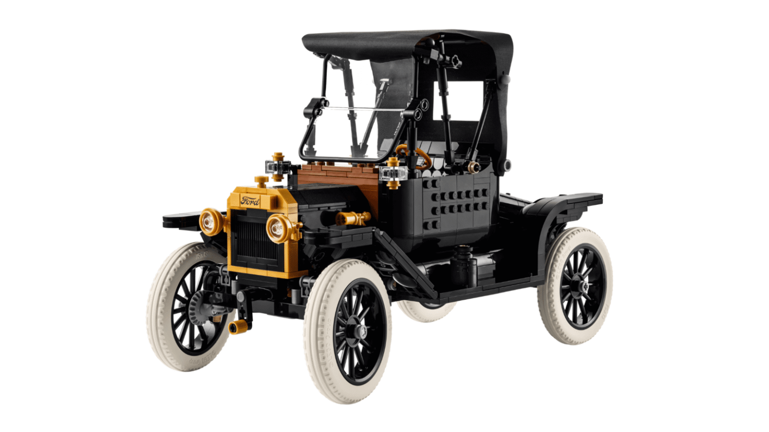 Aimed squarely at adults, the 1,060-piece set replicates the unmistakable shape of the 1910s original in black with gold detailing and tall spoked wheels wrapped in slim white tyres. It’s more than just a static shelf-filler, too. The fabric-style roof folds back, the split windscreen drops down, and there’s a single opening passenger door just like the real thing.